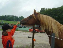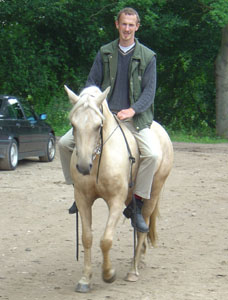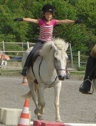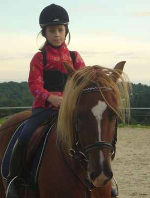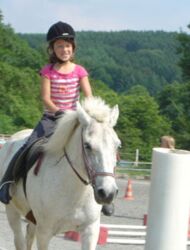 Das Jahr 2005 war ein tolles Jahr für Mandoline und mich. Meine Tochter Julia war schon seit längerem mit dem Pferdevirus infiziert. Julia hatte seit ihrem 5. Lebensjahr voltigiert und begann in diesem Jahr mit den ersten Reitversuchen. Julia macht rasch Fortschritte, am meisten beeindruckte ihre Unerschütterlichkeit. Auch wenn sie mal vom Pferd fiel, vergoß sie keine Träne sondern war flugs wieder auf dem Pferd. Je sattelfester Julia wurde desto mehr entstand bei mir die Vision von gemeinsamen Ausritten. Ich begann Julia zu allen möglichen Events rund ums Pferd mitzunehmen. Manches muß für eine siebenjährige extrem langweilig gewesen sein. Trotzdem verflog Julias Interesse nicht. In den Osterferien fuhr Julia zum ersten Mal alleine in Reiterferien. Es ging auf einen Isihof im Bergischen Land. Zum Abschluß konnten die Kinder auf dem Hof ihren Eltern in einem kleinen Schauprogramm zeigen was sie gelernt hatten. Julia war sichtlich stolz und glücklich mit "ihrem" Pony.